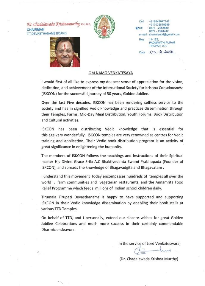 ISKCON 50 Message - Sri Chadalawada Krishnamurthy, Chairman, Tirumala Tirupati Devasthanam (TTD) Board of Trustees