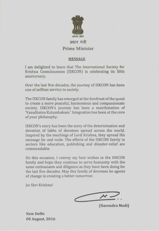 ISKCON 50 Message - Narendra Modi, Prime Minister, India